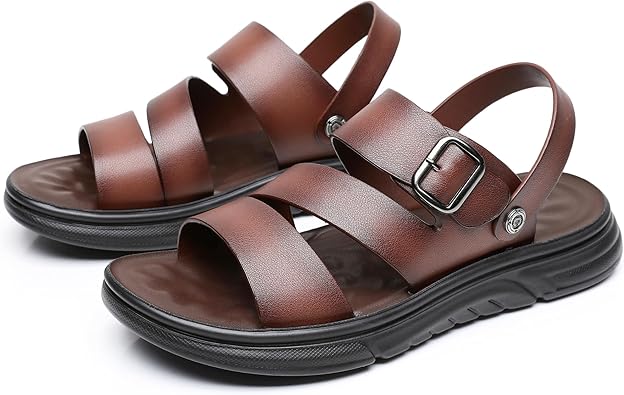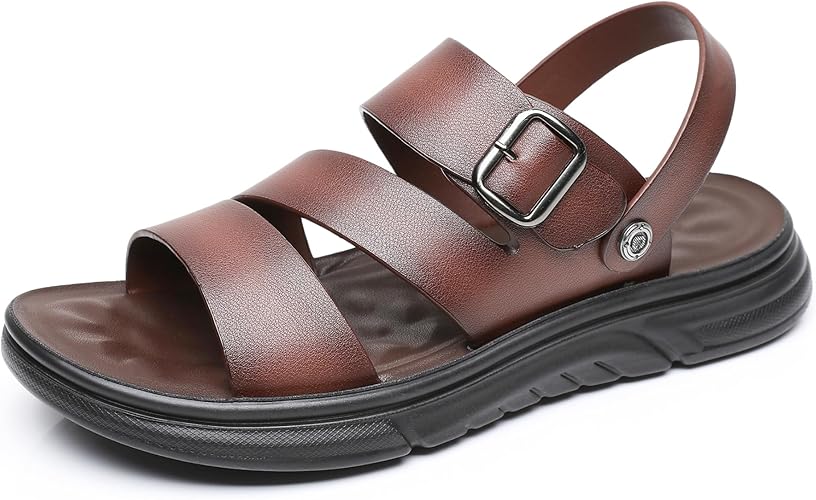 Finishing & Sewing Men’s Leather Comfort Beach Sandals with Adjustable Buckle Strap